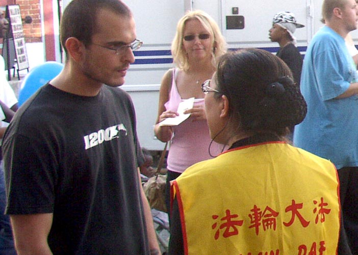 在国际文化展示地段,学员在摊位上,展示了多种语言的大法书籍,摆放了法轮大法洪传世界的展板,还用电视播放介绍大法功法的录像。有的学员给参观者分发,介绍大法以及大法在中国受迫害的真象传单。