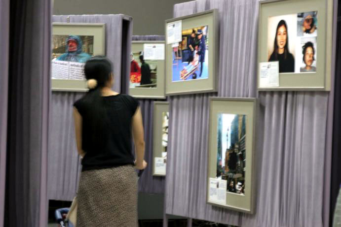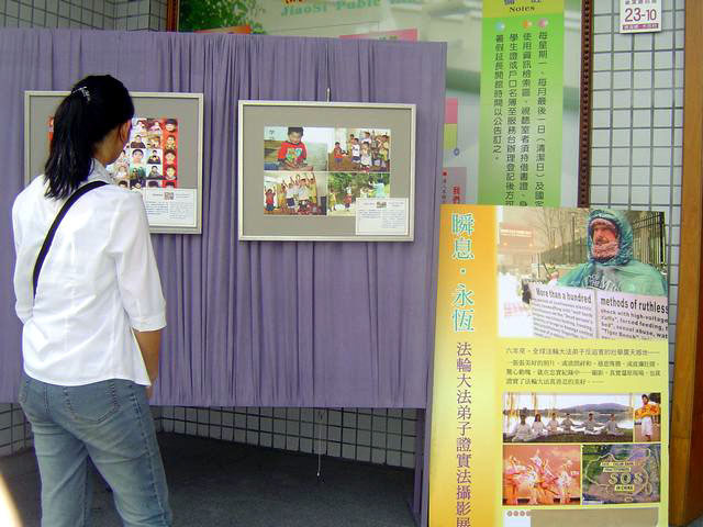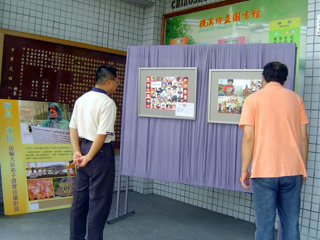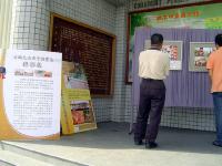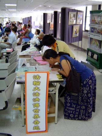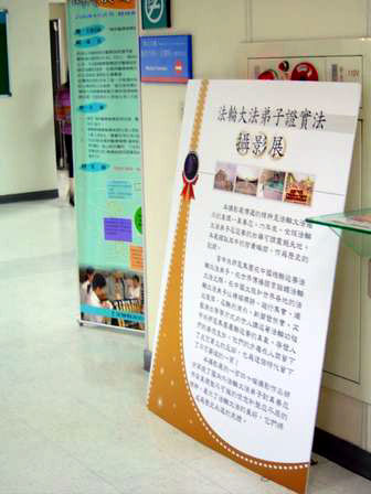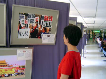 ![]() 入口处的摄影展说明 | ![]() 候诊的民众观看摄影展 | ![]() 签名支持反迫害 |