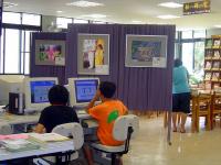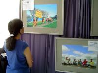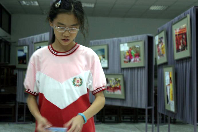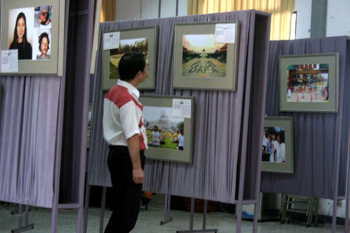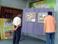 ![]() 图书馆门口的摄影展说明 | ![]() 图片展架从图书馆门口开始陈列 | ![]() 有缘人明了真象 |
