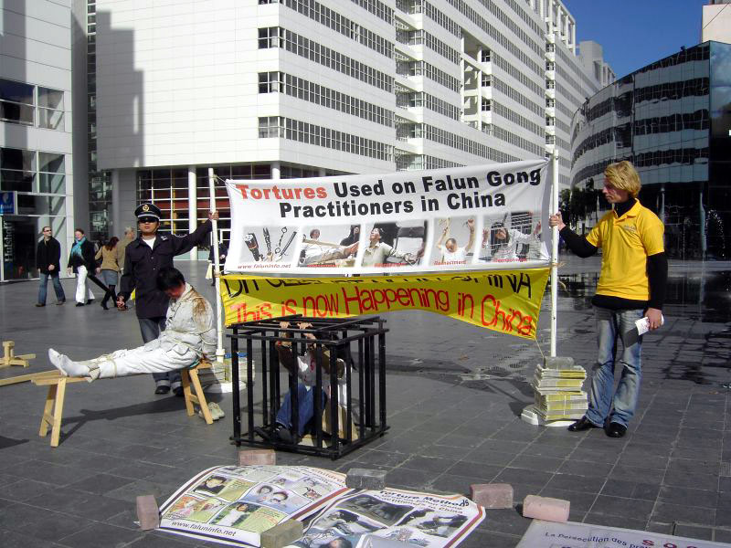 广场的中心是一股股美丽的喷泉。喷泉前方是身着黄色衣服的法轮功学员炼功的身影。在他们的侧边,两位女士或被关在笼子里,或被绑在老虎凳上。她们白色的衣服上是点点血迹,脸上则是累累伤痕。原来她们在模拟中国大陆法轮功学员在监狱里受到的酷刑。在她们的身后,站着挥舞着警棍的“恶警”。