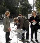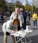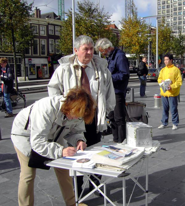 当了解到在声援诉江案的请愿信上签名会减轻迫害甚至帮助制止迫害时,人们,包括不少外国游客,纷纷签名表示支持。有一位坐在轮椅上的先生,在请愿信上郑重的签下了他的名字。还有一位先生在路过反酷刑展时,正要去吃午饭。后来,他特地折回来签名。众多的支持者中,有人说,你们干得好!有人说,祝你们成功!有人说,谢谢你们!