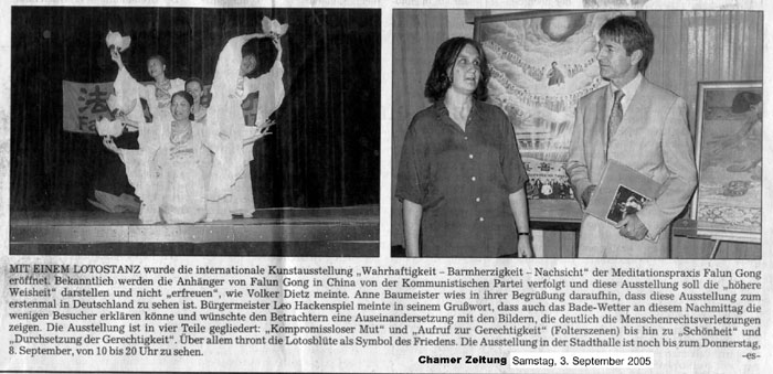 九月的头一周,真善忍国际美展作品在巴伐利亚森林里的旅游城市卡姆亮相。中国传统舞蹈莲花颂拉开了美展的序幕,把来宾们带入一片祥和。接下来的嘉宾发言引人深思,在场的人意识到在中国的这场迫害之严重,对画展本身所具有的精神内涵和深远的意义也由衷的表示敬意。
