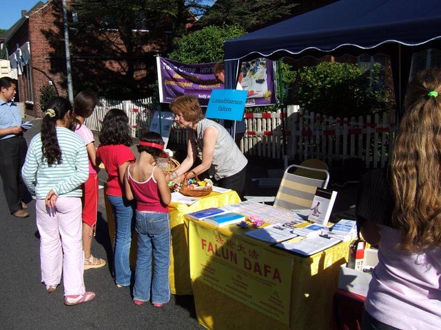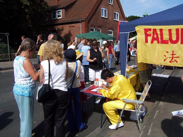 今年,德国北部的法轮功学员也全程参加了三天的活动,他们向参加节庆的观众演示祥和的法轮功功法,介绍宇宙法理“真、善、忍”,并揭露中共恶党六年来对法轮功学员的邪恶迫害。