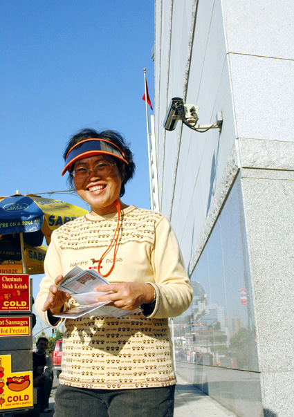 ,春夏秋冬,寒风雨雪,从没有间断过。这些学员们来自世界不同的国家,每天都有不同的面孔出现在这里,用自己的行动让过往的行人们了解法轮功真象,让在对面的中领馆里的人们了解法轮功真象,让来这里办公的中国人和外国人能够有机会了解法轮功真象。这里的气候也确实不同于别的地方,又阴又冷的,每个人都感受到了这一点。过往的人们总是停下来帮助法轮功学员出一些主意,明白真象的人们都希望发生在中国的这场迫害快些结束。