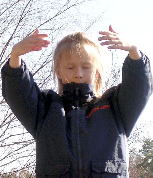 我和妹妹MIRA常常在一起玩在一起笑。我炼法轮功时她常常在一边玩, 有时她也炼一会儿,等她长大了就好了。我有一个梦想,将来我要光着脚在一个大大的草地上尽情的跑,听鸟儿唱歌儿。我也许会遇见一只梅花鹿;多好啊!我希望能够飞上天,到我的真正的妈妈爸爸那儿。
