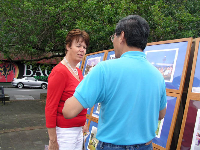 “大法弟子证实法摄影巡回展”于2005年10月30日来到了奥克兰市旁边的Parnel区。在摄影展展出的过程中,有一位西方人听了法轮功学员讲述每幅摄影作品背后的真实故事和在中国大陆的法轮功学员如何坚定真、善、忍信念,抵制共产邪*党-长期迫害的真象后说:“是谁给了它们权力迫害了那么多好人!是共产党吗?如果是它早应倒台了!我支持你们把它们告上法庭。”