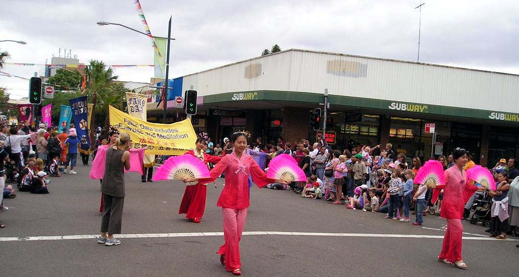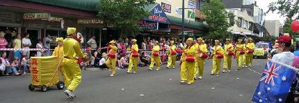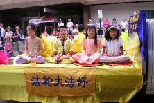 ![]() 花车上打坐的小弟子 | ![]() 法轮功学员的队伍受到人们的欢迎 |