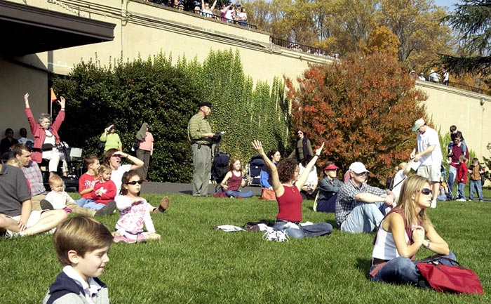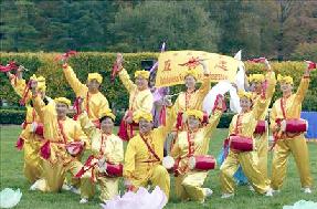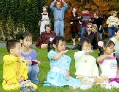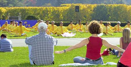在菊花展馆前、主喷泉公园旁,来自费城、南泽西、特拉华地区的法轮功学员为游客们,表演了两场中国传统的腰鼓和法轮功功法。天气出奇的好,在环境优美的花园里,伴着中国传统的音乐,观众都沉浸在法轮功祥和、宁静的功法展示中。一直在静静的观看法轮功表演的Mary说:“表演得棒极了!很美。”有很多人在模仿着学炼功动作。