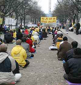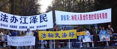十一月十一日,胡锦涛在访问柏林的第二天分别会见了德国现任总理施律德(Schroeder)和预定在本月二十二日就任的下任总理梅克尔(Merkel)女士。来自德国、法国、意大利、奥地利、挪威、丹麦、瑞典、瑞士、荷兰的部份法轮功学员在断断续续的小雨中坚持在胡锦涛下榻的阿德龙(Adlon)酒店外二十四小时请愿。