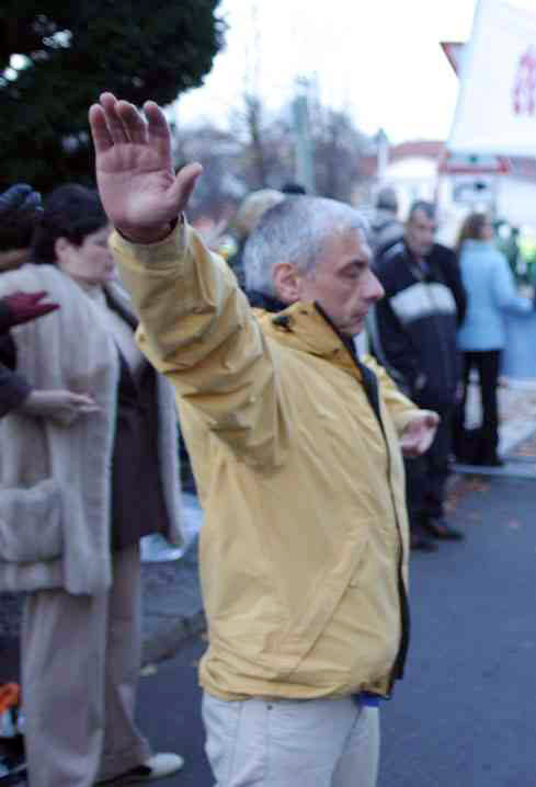 ![]() 法轮功学员科尔普在抗议地点炼功 |