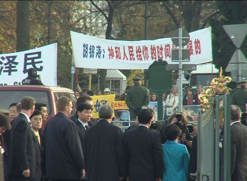 在胡锦涛抵达之前,德国总统科勒在乘车准备进入双方的会议地点时,曾特意下车走到正聚集在对面街道上、呼吁胡锦涛结束迫害的法轮功团体和国际大赦面前,与其代表握手,并询问了这两个团体各自有什么诉求,并表示他将在与胡锦涛会谈时明确提出中国的人权问题。