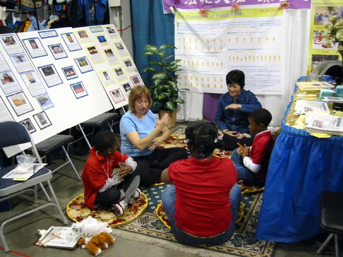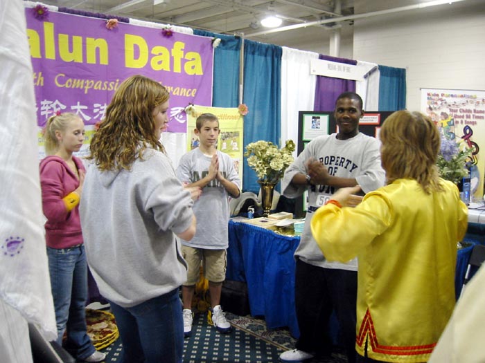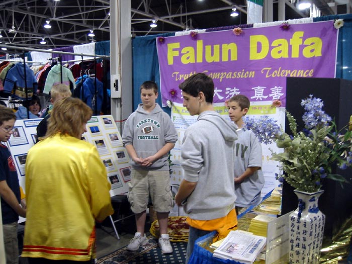 【明慧网2005年11月14日】2005年11月3至6日,美国印第安纳波斯市举办了一年一度的展现印城多元文化的国际文化节。为期四天的集教育,娱乐,饮食为一体的丰富多彩的活动吸引了成千上万的民众前来领略异国风采,学习不同民族的文化习俗。一些中小学校还组织了全校师生前来参观。完美体现中国传统文化的法轮大法的展位前自然吸引了众多对东方文化好奇和神往的人们,其中包括许多天真烂漫的孩子。他们中很多是第一次听说并体验东方神秘的打坐冥想。“法轮大法”,“真善忍” 也如种子一样埋入他们的心田,带给他们美好的未来。
