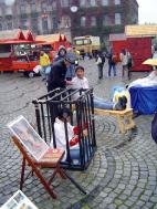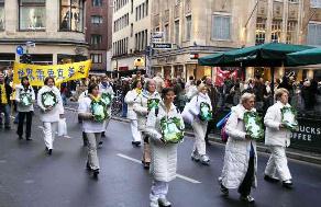 11月12日下午2点整,由腰鼓队开道的法轮功学员游行队伍从杜塞尔多夫的火车总站广场浩浩荡荡的出发了。整个队伍由腰鼓队、古装仙女队、身着白装手持受害同修照片的学员以及上百条横幅和图片展板所组成。当天是星期六,很多市民在闹市里购物和逛街,当他们听到整齐嘹亮的腰鼓声,看到规模盛大的游行时,都不禁停下匆匆的脚步仔细观看。在两个半小时的游行中不断有记者和路人拍摄游行的各个方队,驻足的行人们更是在学员一声声的问候中欣喜的接过了真象资料。