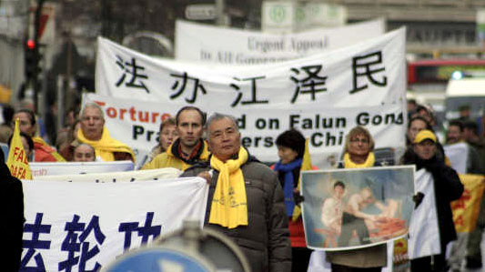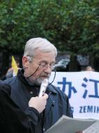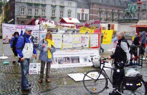 游行的目地地是在莱茵河畔市政府附近的广场上。当游行队伍汇集到这里时,由民运人士,人权组织代表,欧洲法轮大法协会会长,在中国受过迫害的法轮功学员等做了约一个半小时的演讲。他们以各自不同的角度描述了中共统治下法轮功群体受到的迫害和呼吁德国民众和政府在胡锦涛访问德国期间呼吁制止这场迫害。