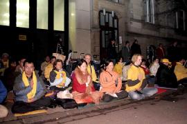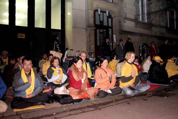 11月12日晚,胡锦涛在杜塞尔多夫市的Staendehaus与两百名德国官员共进晚餐。法轮功学员也在宴会楼正门外的草坪上和平请愿,呼吁制止对法轮功的迫害。虽然活动事先得到了许可,但是警察却过来禁止学员们用扩音器喊话,并屡屡要求学员后退。警察表示,是因为宴会楼内传来的要求,才这样做的。在晚宴快结束时,警察将大门以外几十米开外全部戒严了,禁止任何人进入。学员们有的发正念,有的继续与警察讲真象,最后在车队经过时两名学员还是将“法轮大法好”的横幅在车队两米处展开。