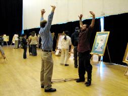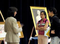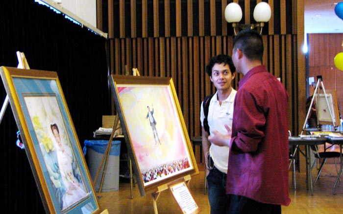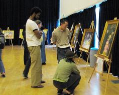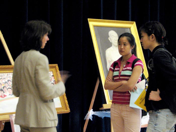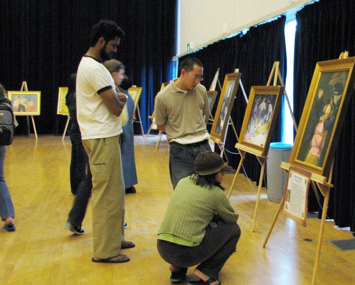 这位男生马上表示明白了;随后认真听学员讲解了每幅画的故事,还问到:那里有学炼功的。在该校读书的法轮功学员,预先想到有人看画展后,会想学功,所以特意安排了两天后举办免费教功班。学员把印有教功班时间地点等信息的传单和真象资料交给他时,他紧紧握着学员的手,高兴的说:“太好了,谢谢。”