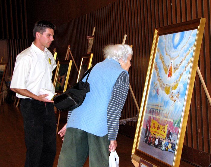 她还表示,真善忍画展的作者都修炼法轮功,这些画是根据他们的亲身经历和感受创作出来的。所以,画作中有的表现他们修炼后,身心得到纯净,思想境界得到升华的部份,也有表现中共迫害法轮功的残忍手段、及学员遭受折磨仍表现出坚忍不屈的部份,也有呼吁正义良知,法办恶人的部份。