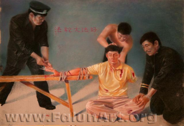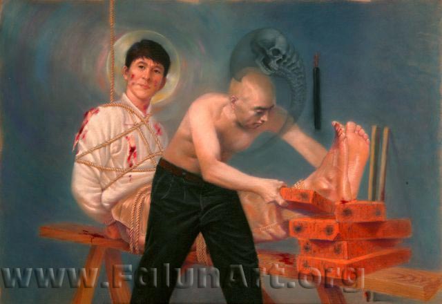 ![]() 老虎凳“是江氏集团经常用来折磨法轮功学员的一种酷刑。画家为受刑者画上明亮的光环,而狱卒头上是一个象地狱之鬼一样的面孔,表达了他们今生的选择决定了他们未来的归宿。 |