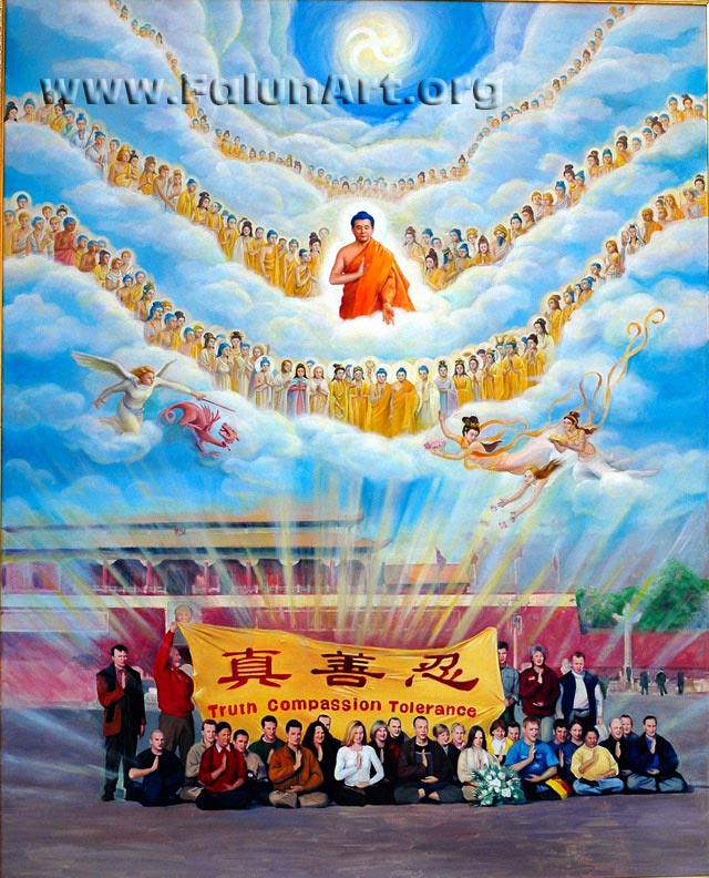 ![]() 跨越千山万水,三十六名西人大法弟子到天安门前打出了”真善忍“的横幅,向中国人民讲述法轮功的真象。这一刻,金光万丈,众神都被他们所震撼,天上人间,所有的眼光都注视着这里所发生的一切。 |