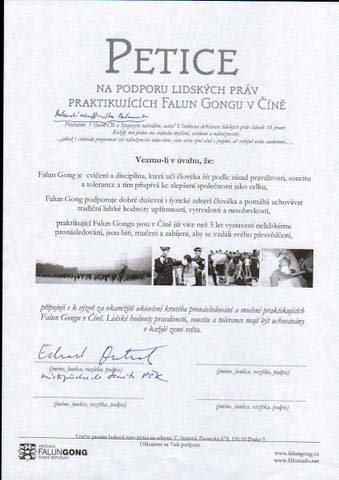 最后,Outrata 先生在“呼吁立刻停止在中国对法轮功学员的残酷镇压、酷刑折磨。‘真、善、忍’的价值观应在世界上任何一个国家得以保留。”的请愿信上签了名。