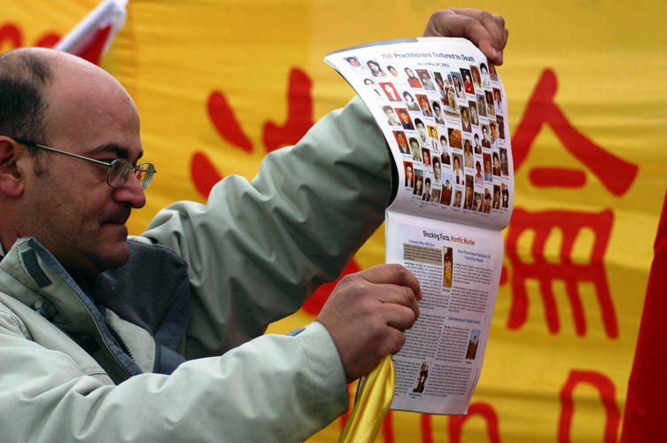 ![]() 向欢迎团队讲真象的白人法轮功学员 |
