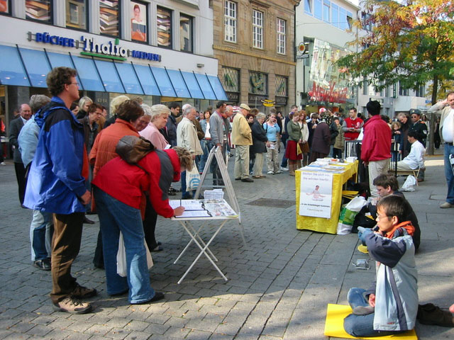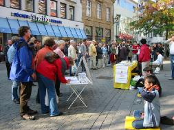 学员们在购物中心前设立一个信息展位,并以真人模拟的方式展示了法轮功学员在中国遭受江××邪恶集团和中共恶党酷刑迫害的真象。那是一个极佳的地点,因为它靠近行人购物区内的一个交叉路口,许多来自市区内不同方向的人们都在此处汇集,他们可以很清楚的看到这一切。