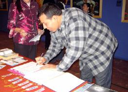 看完画展的人们表情肃穆,心情沉重。当法轮功学员询问他们是否愿意签名声援起诉迫害法轮功元凶江××的诉讼案,帮助制止迫害时,很多人都毫不犹豫的签下了名字。