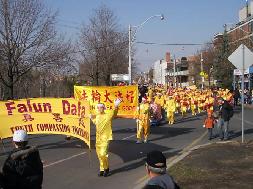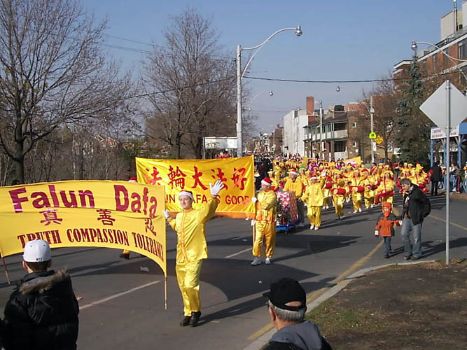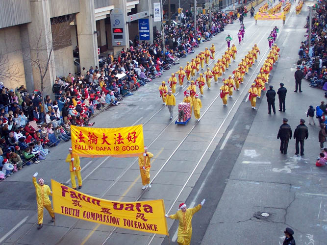 法轮功学员在这个加拿大最大的圣诞游行中,向超过50万现场观众展现了法轮大法的美好以及中华传统文化,还有数百万观众通过电视直播及录像看到这次游行。