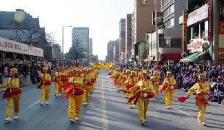 绵延5.7公里的游行路线两旁挤满了观看的人,很多地方的人行道都走不通了。很快人们看到了法轮大法学员的队伍。醒目的“法轮大法好”横幅、一身金黄服装的鼓手们,敲起中国传统的鼓乐。很多观众惊异的看着,有些缓过神来后跟着鼓乐动了起来。