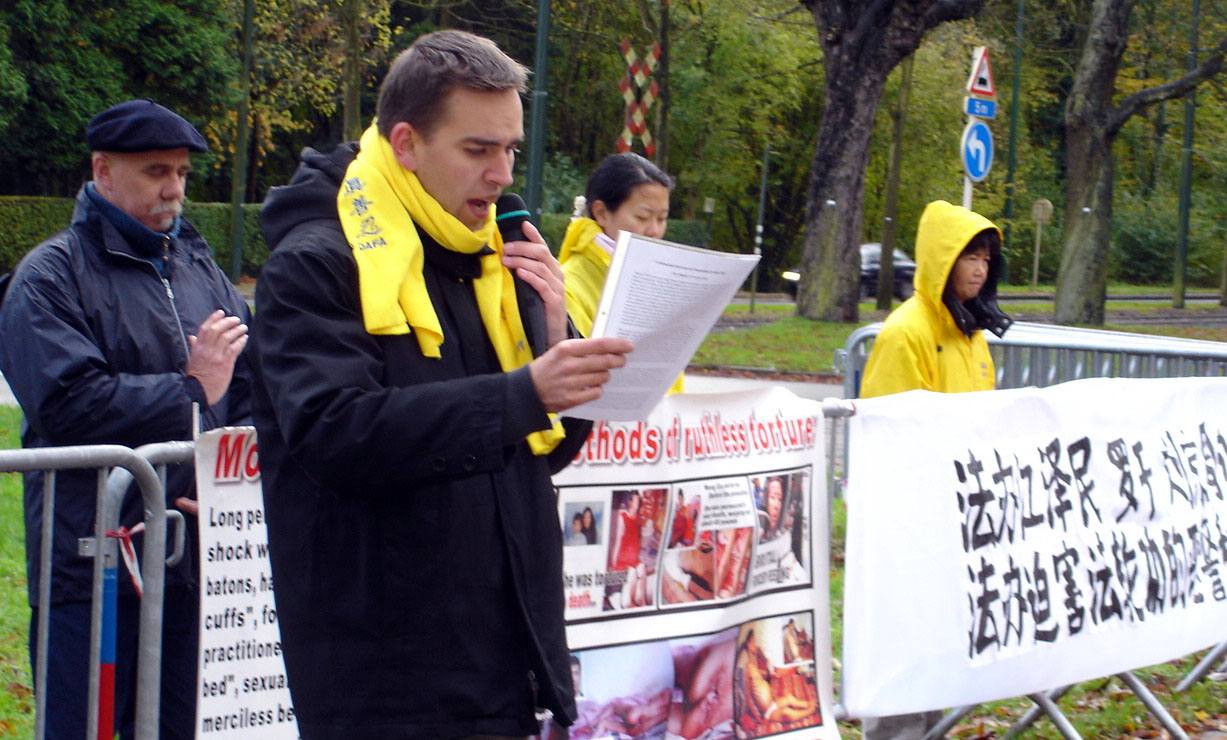 活动的最后,法轮功学员将中文《法轮大法学会公告》用信封封装,投递到中领馆的邮箱;将一份《公告》的法文拷贝送与在此值勤的警察,告诉他们这就是今天下午宣读的文件副本。活动在警察的谢谢声中结束。