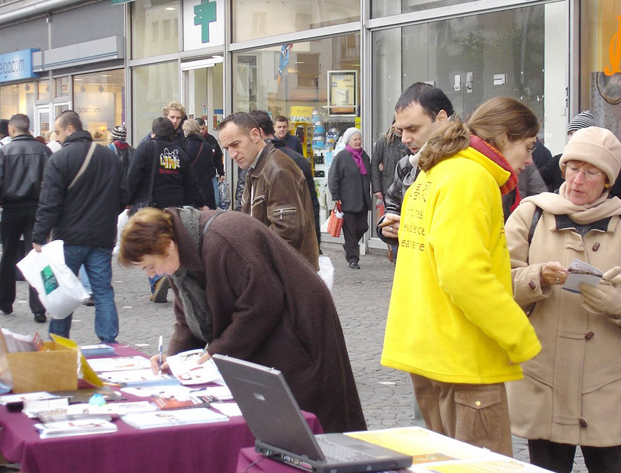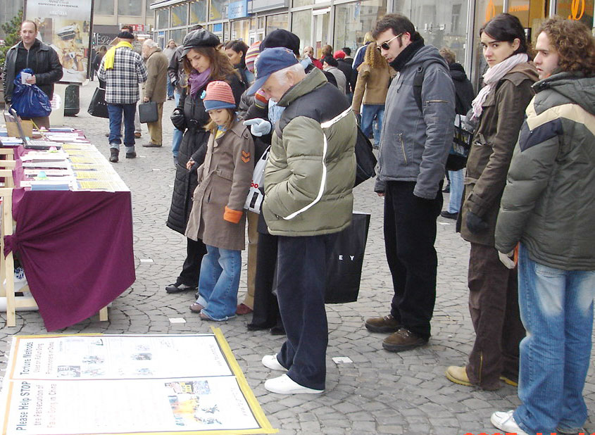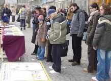这天是周六,学员们从不同的城市赶来参加在市中心商业街上展开的活动。行人很多,摄氏度零下的气温并没挡住人们出来购物的热情。街头,法轮功学员的展板、资料、美丽的纸折莲花以及优美音乐伴随的法轮功功法展示吸引着过往的人们,而与此同时在中国发生着的酷刑与虐杀则令人们震惊和愤慨。人们关注的眼神,认真的阅读,不断的询问;主动的签名支持……这一切显示着迫害的不得人心和当人们了解了真象后善心的力量。