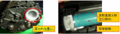 2) 废粉的处理:将墨盒中的碳棒取掉(先卸掉螺丝及压盖),轻轻抖动(或轻敲)废粉盒仓体,让粉直接从粉仓口(与碳棒接触的一侧)倒出,一般新粉用过2-3瓶后倒1次废粉。这样,不需要拆开墨盒,既快又可以延长墨盒寿命,自己半年实践效果较好。