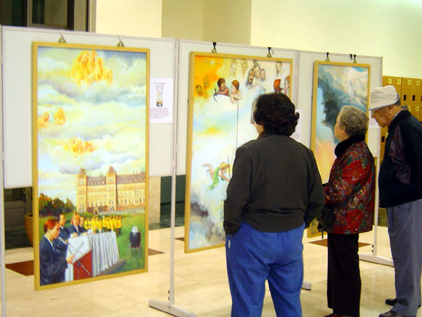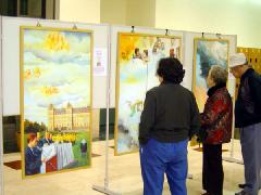![]() 老者观画。(左方这幅画名为人民法庭。为了帮助人们了解独裁者镇压法轮功的残酷本质,法轮功学员在世界各地举行了模拟审判。此幅是根据渥太华加拿大国会前的模拟审判而作。) |