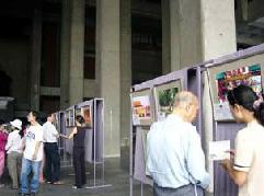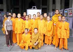 一群从泰国来的喇嘛(约二十多位),走进摄影展参观,经导览解说和翻译,很仔细的一幅幅的看着,并主动要了很多服务台的法轮功真象材料,最后学会了一句中文“法轮大法好”,在会场合照,依依不舍的离去。