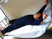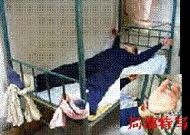 此种酷刑即是将学员扣在铁床边横棱上,腰和臂部硬塞至床下。遭受此刑者非常痛苦,严重者腰部受伤,不能直立。