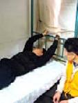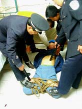 此种酷刑是锦州教养院经常使用的一种强行“转化”法轮功学员的酷刑。它们是首先用站刑,几天几宿不让学员睡觉,再与此刑相配合。把学员用手铐背扣上,再用绳子把学员双腿双盘起来绑上,用脚踩。然后再把上身和下身压成一个平面,仰面推倒在地,由三个恶警和一个四防员用电棍专电学员的脚心、后心、心口窝等处。另外两个恶人用手拧学员脑袋并毒打,然后将学员拧过来,翻过去、任由恶警用电棍专往敏感处电。受此刑的人,数月不能行走。