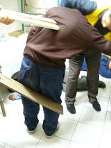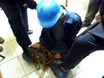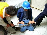 此种酷刑是将学员两腿双盘,两脚向后拉、由两恶警分别用脚蹬学员双盘的两膝盖,同时用粗绳子将双腿捆住,再分别拉绳的两头狠拽至极限,又一恶警死死的摁住后背,动弹不得,然后往学员臂部底下塞木棍,就这样长时间逼学员坐着。受此酷刑严重者腿被绑折,长时间不能行走。