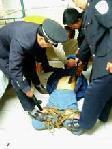 3)最后带进一名学员,进屋后由一四防员用双臂将学员脖子挟住,然后由两个四防员用大板子往腰部、背、腿、狠命的猛砍。直到将人打昏后,四防员用脚踩三个被打昏死过去的学员的头、脚、手,见学员确实昏死过去,凶手才扔下木板子扬长而去。三个学员被打得全身呈黑紫色,脸变形,不能走路。(如图32、33、34)