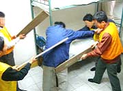 2)再带一学员进屋,两个四防抡起大木板子就打,把人打跪在床边,四防仍然狠命的打,学员的后背、头部均被打伤,最后昏死过去。(如图29、30、31)