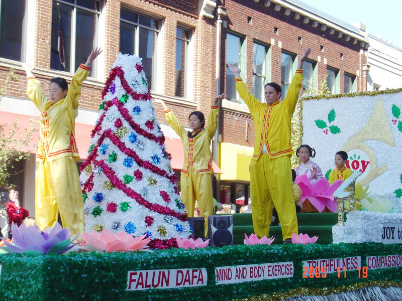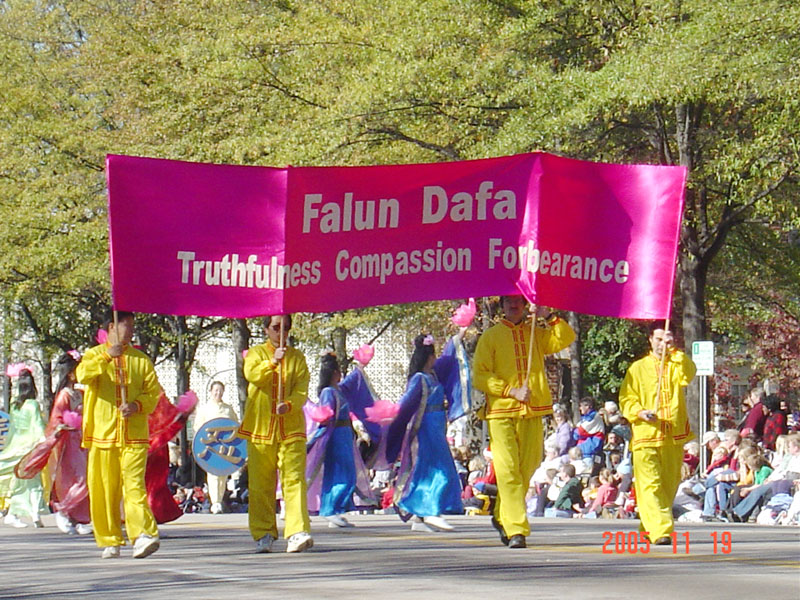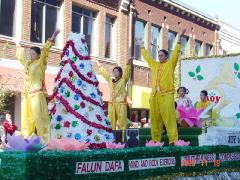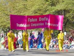 ![]() 由腰鼓队、莲花舞队、及功法表演组成的法轮大法队伍 |