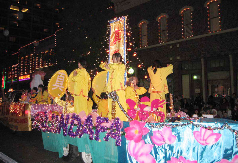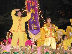 法轮功学员队伍这次除了有受人们欢迎的唐装舞蹈队,唐鼓队,还有以船的造型展现的花车。