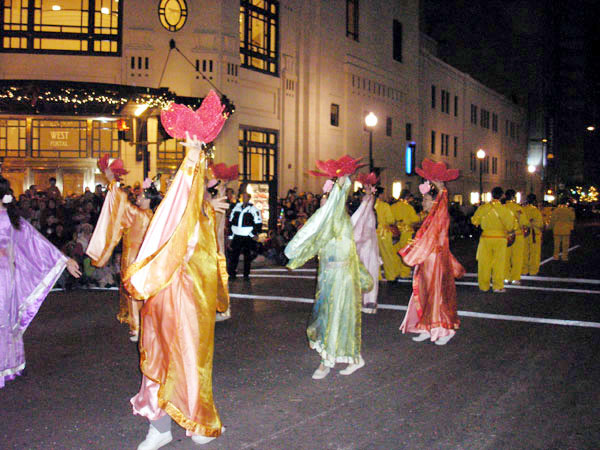 以蓝、绿色的布为背景,象征着碧波,上面点缀着朵朵粉色的圣洁的莲花,船桅上挂着竖条幅,写着“法轮大法”、“真、善、忍”,船的两侧的横幅写着英文的“法轮大法”、“真、善、忍”,上有身着金黄色炼功服的学员在载满莲花的船上向人们演示着法轮功的功法,还有身着古装的仙女和小孩子们向人们问候节日快乐。