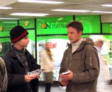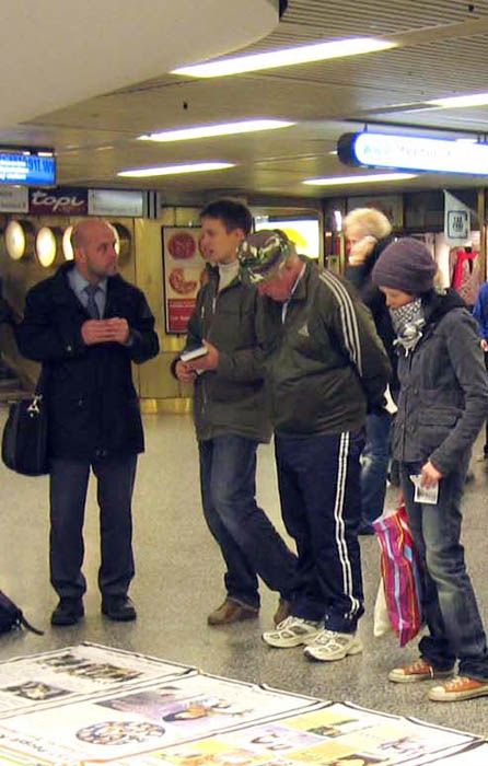 中午时分,学员在大厅内摆放了图文展板,介绍法轮大法洪传世界的盛况,并揭露自1999年7月20日始,邪恶之首江××伙同中共恶党对中国大陆的法轮功学员长达六年多之久的残酷迫害。同时,学员还演示功法,并向人们散发法轮功真象资料。
