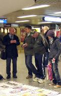 络绎不绝的旅客和过往行人,被优美的炼功音乐和舒展祥和的功法所吸引,纷纷驻足观看,更有许多人目光转向图片展板想看个究竟,还有人已迫不及待的阅读起手中的资料了,其中一些人还主动向学员询问更详细的情况或自己不解的问题。