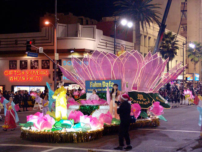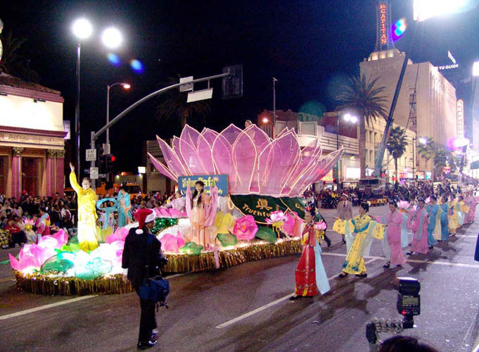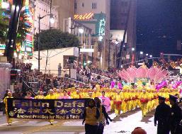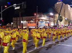 由洛杉矶、圣地亚哥、旧金山的部份法轮功学员组成的游行队伍,包括舞蹈队、鼓队、花车,是参加游行的唯一一支华人队伍。近百人的、一身金黄色套装的腰鼓队,在众多的鼓号乐队中十分引人注目。队伍所到之处,伴随着整齐的鼓声,“法轮大法好”的歌声、“普度”、“济世”音乐声响彻大街上空。