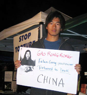组织者发给每人一个展板和蜡烛,并请他们仔细阅读展板上的内容。展板上写有目前正在遭受酷刑折磨或已被折磨致死的人的名字并印有他(她)们的照片。有几个展板上写的是对被江氏邪恶流氓集团迫害致死的法轮功学员高蓉蓉的介绍。