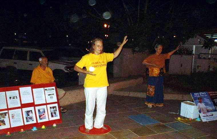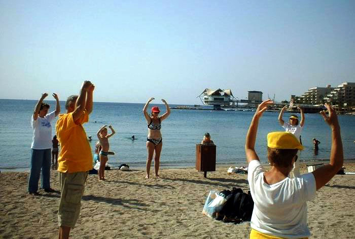 一早,学员们在喧闹的海滨沙滩开始了炼功,不少感兴趣的人也模仿着他们做炼功动作。有几名德国籍的俄罗斯旅游者也特别感兴趣,其中一位女士还学会了功法, 并表示回德国后以一定坚持炼功。很多以色列人也都非常高兴观看功法展示。