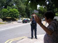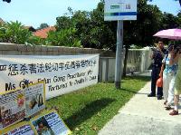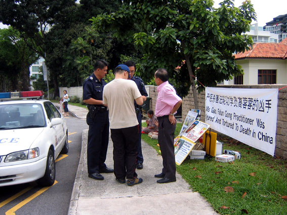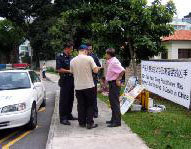 新加坡法轮功学员从今年6月中国法轮功学员高蓉蓉被警察毁容虐杀后,开始每天在中国大使馆前呼吁制止中共迫害法轮功学员,要求严惩杀人凶手。警察一开始每次抄学员的证件,学员也是每次告诉他们法轮功真象,希望他们明白法轮功学员为什么要去中使馆呼吁。警察都知道了真象,而且也熟悉了每个在那里的学员,但是还是要抄证件,后来学员开始拒绝给警察证件号。