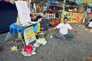 今年,学员们在这里立起了帐篷,装点上莲花,打开了介绍什么是法轮功以及中共如何残酷迫害善良的法轮功学员的真象展板,学员有的炼功,有的讲解展板,有的折叠纸莲花,不少游人被吸引了过来。