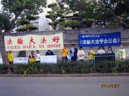 举起“法轮大法好”、“法轮大法学会公告”等横幅的学员们面向着中领馆整齐的排好了队列,沿着道路排列的揭露中共残酷迫害法轮功的真象展板更加显眼。“法轮大法学会公告”宣读了共五次。